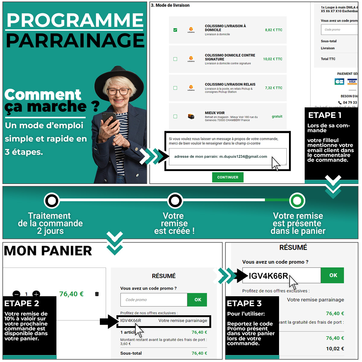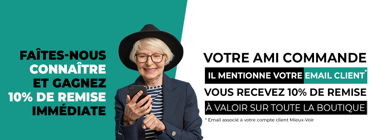 Lors de sa commande votre filleul devra mentionner votre adresse email, dans le message de commande. L'email demandé, est celui que vous avez utilisé pour créer votre compte Mieux-Voir.